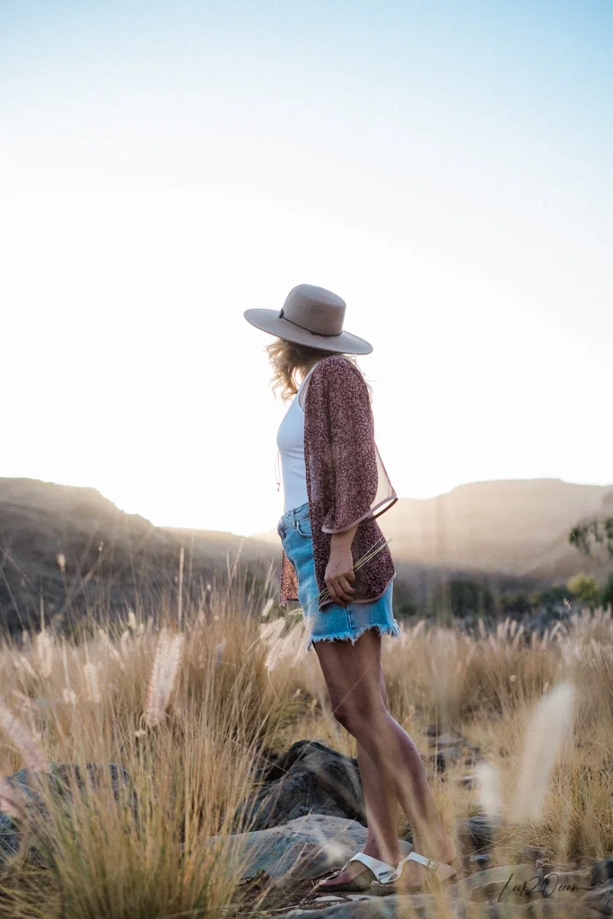 I like to keep things simple and easy to style. So I wore a white tank top tucked in a high waisted denim skirt and over the tank top another diy kimono, which I sewed in a light transparent floral print. Completed this look by adding a brimmed brown hat, and my super comfy mother of pearl-coloured Birkenstock’s.