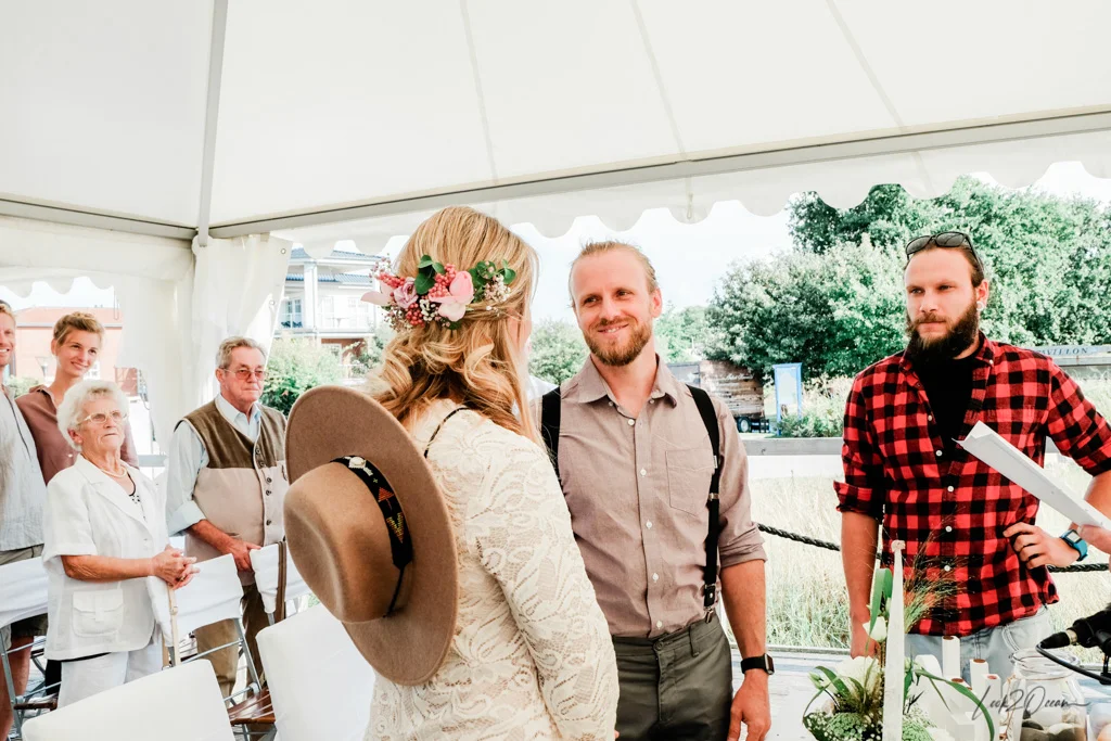 When we were looking for a suitable location, we came across the bar “Tatort Hawaii”. Only since a few years it is possible to be married at the beach by the mayor of the small town called Stein. The wedding ceremony takes place on the beautiful dune terrace with a view of the bay.